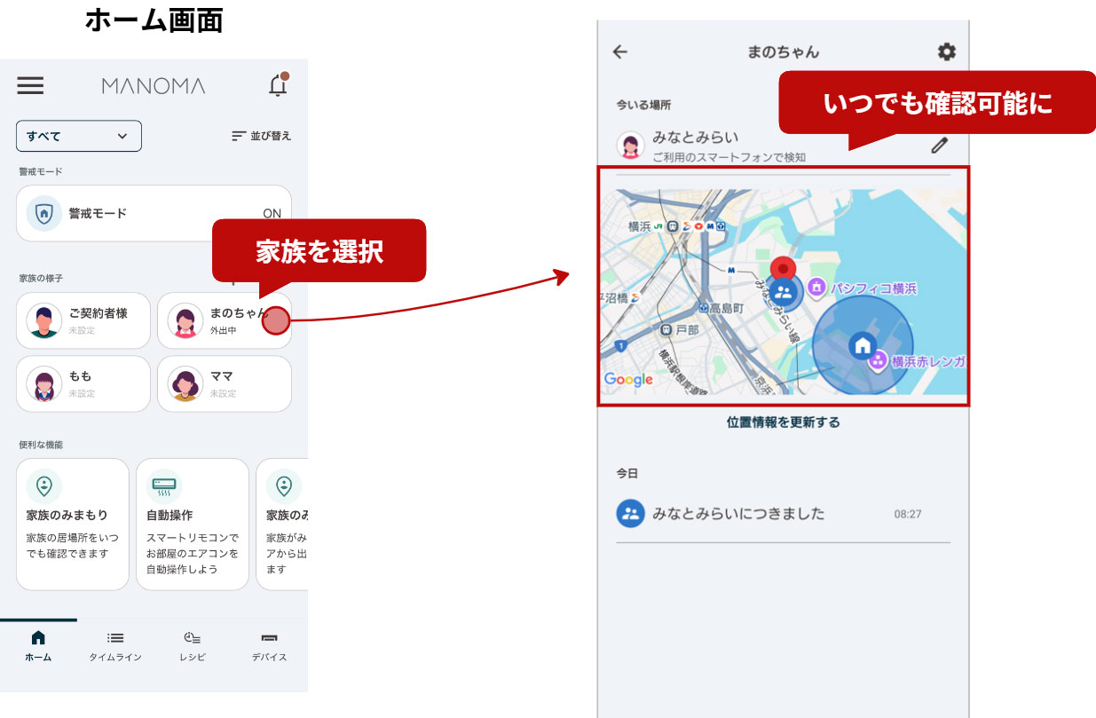 登録した場所以外にいる場合でも家族の位置情報が地図上で確認できるようになりました。