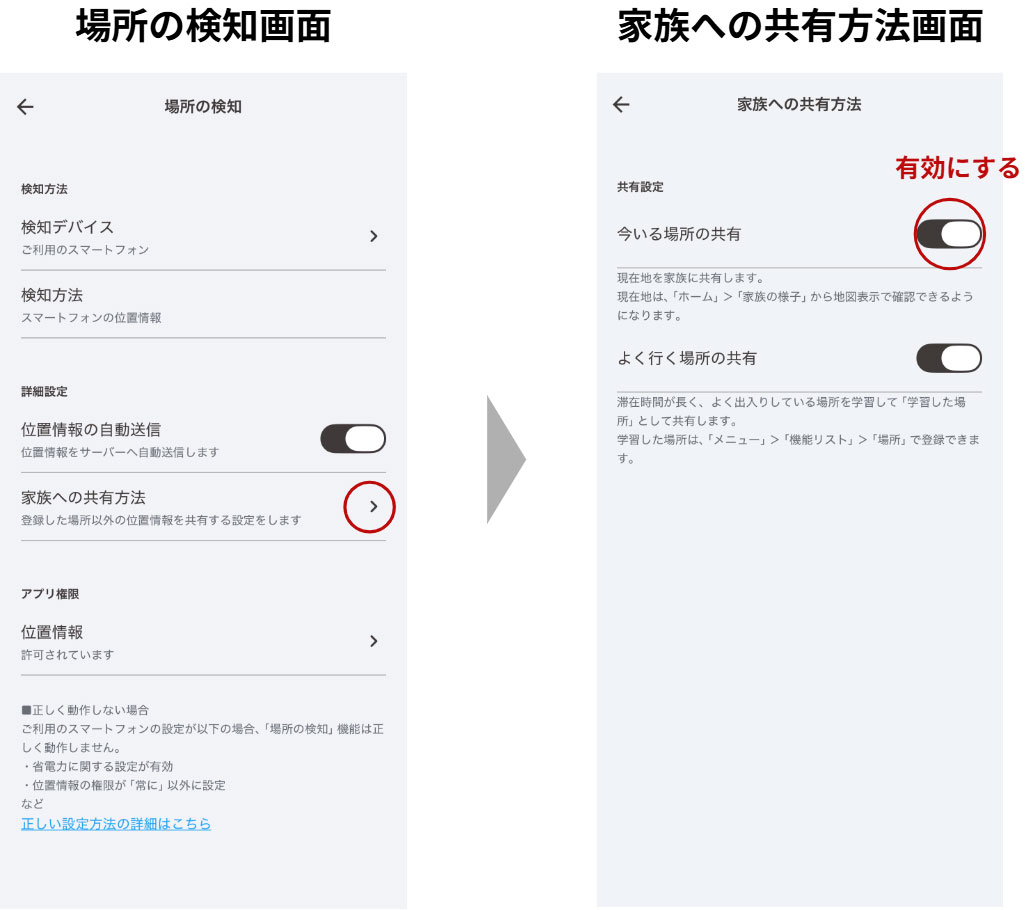 ⚫︎設定方法:家族の共有方法画面で「今いる場所の共有」を有効にします。