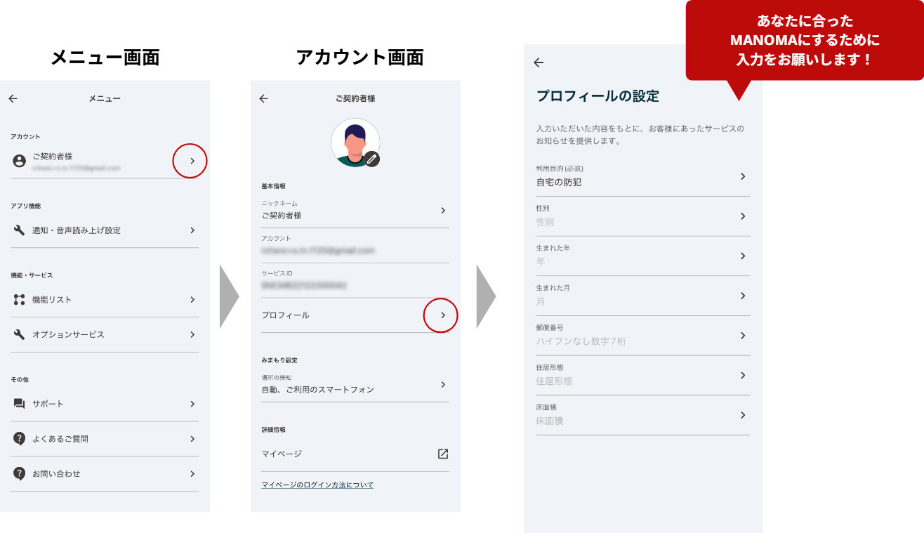 プロフィール設定でプロフィールの登録をすると、入力いただいた内容をもとに、お客様にあったサービスのお知らせを提供します。
