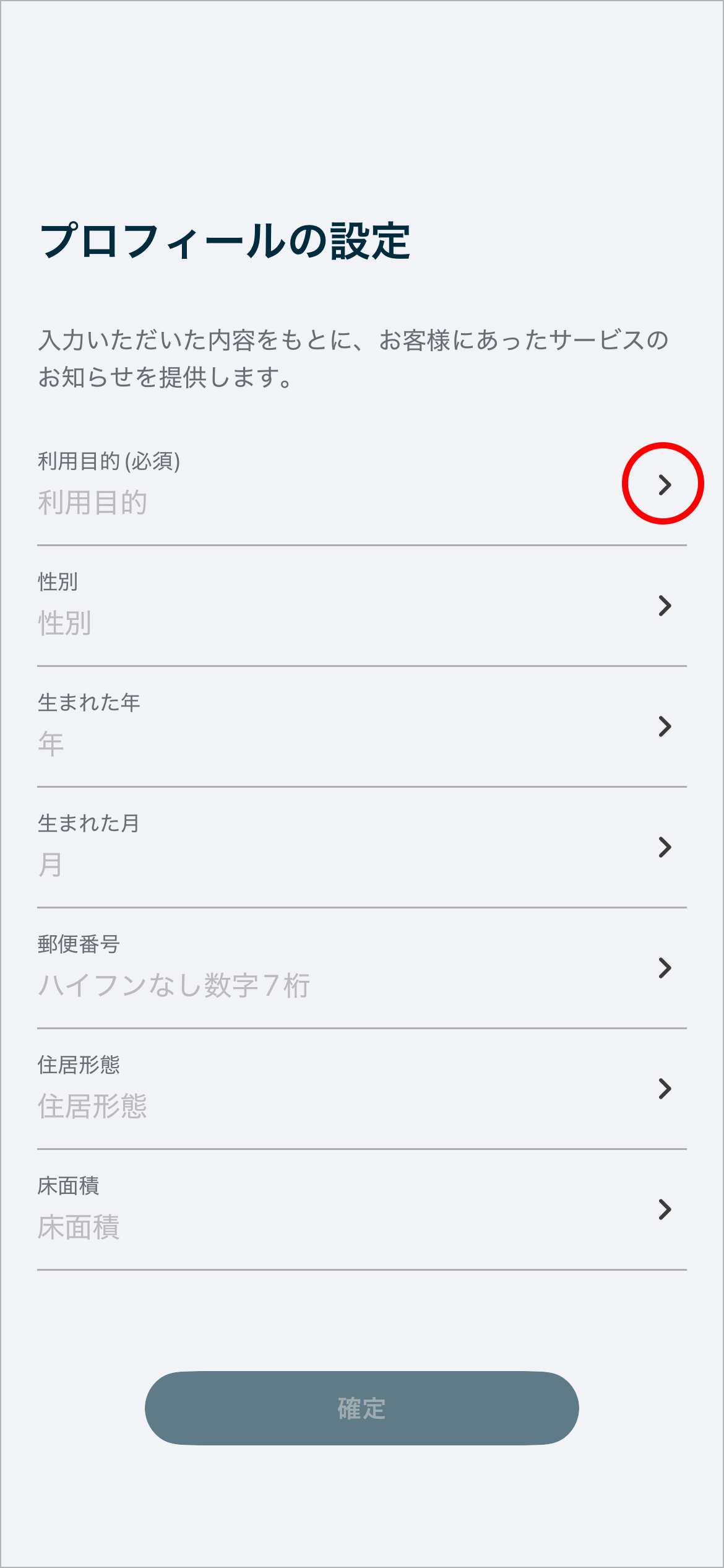 1「利用目的」をタップします。「利用目的」のみ入力必須の項目です。その他の項目の入力は任意です。