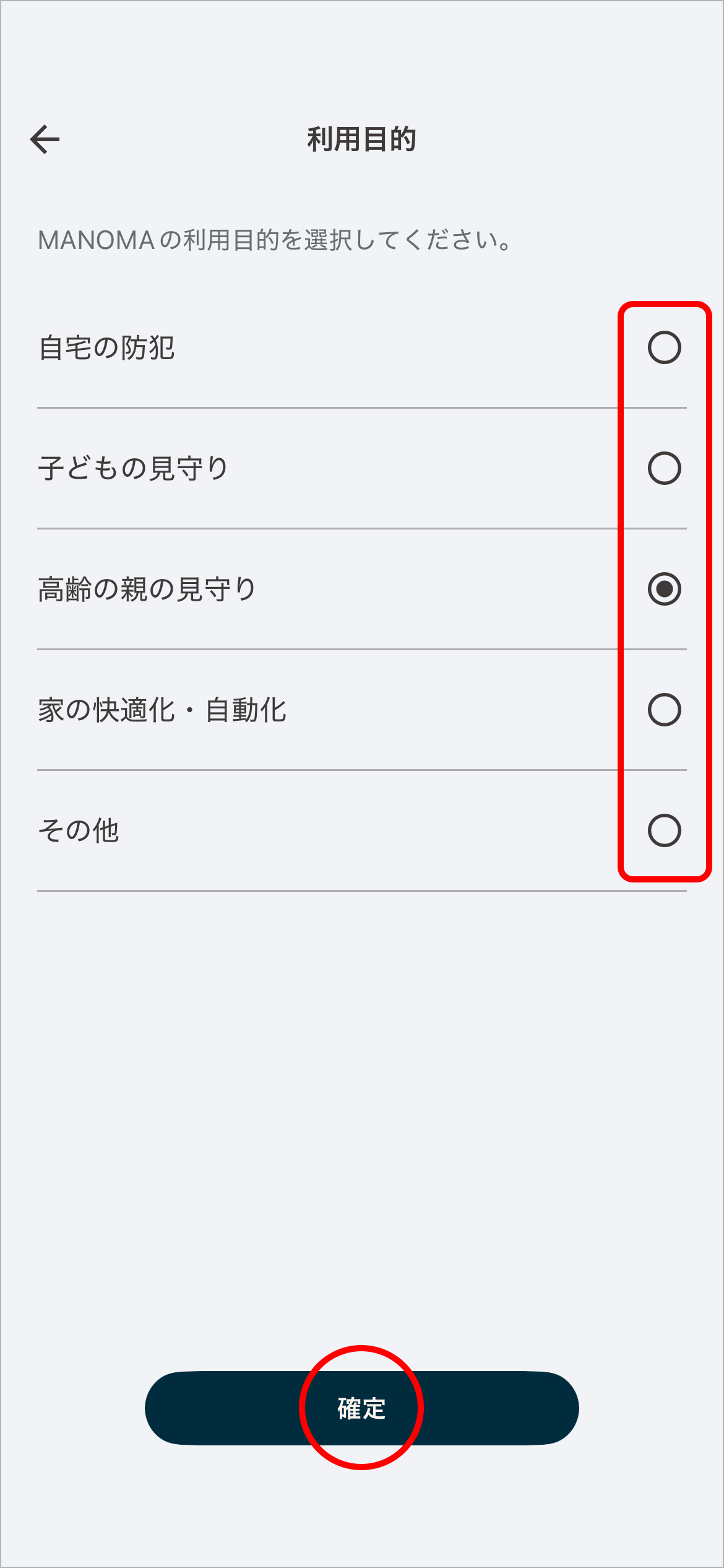 2利用目的をひとつ選択し、確定をタップします。