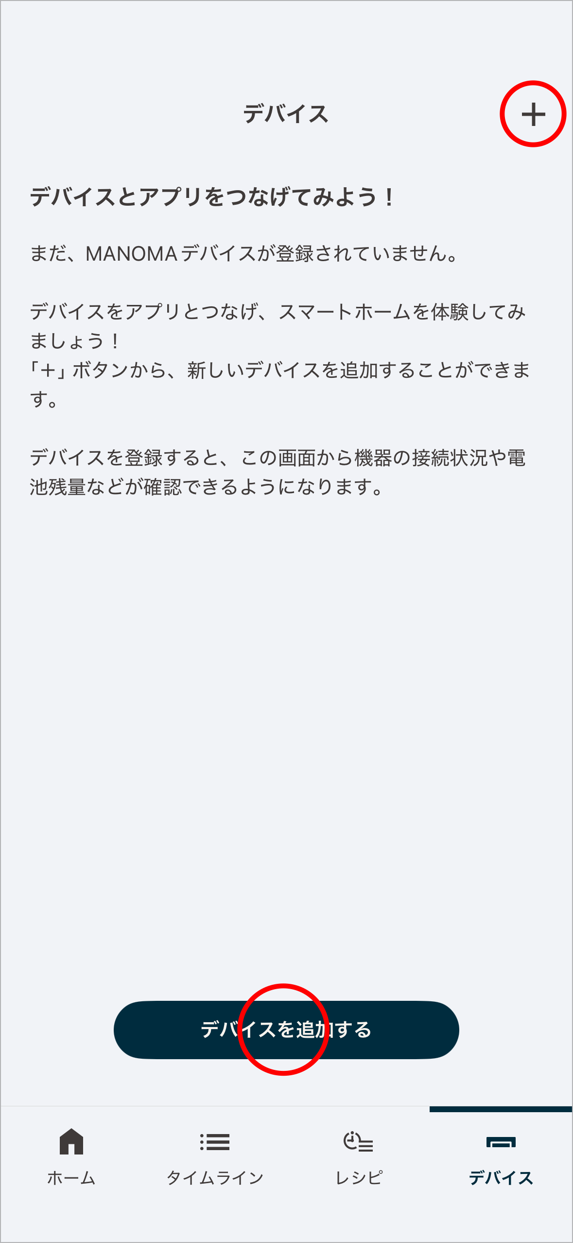 2デバイス登録画面で右上の+ボタンまたはデバイスを追加するをタップします。